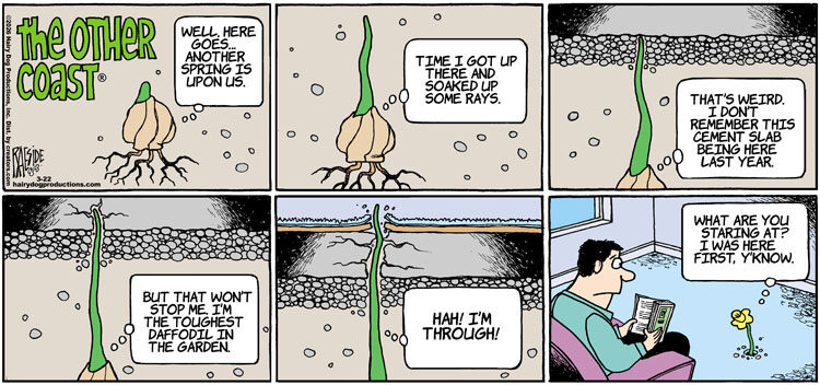 The Other Coast strip was picked up by Creators Syndicate in 2001 and now appears in over 200 newspapers worldwide. The second Other Coast collection, This Is Your First Rock Garden, Isn't It? was published in 2005.