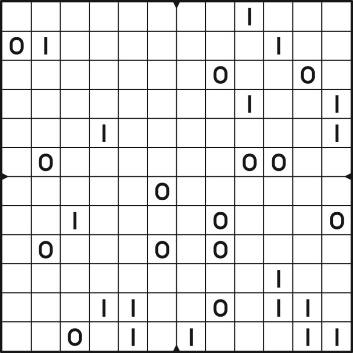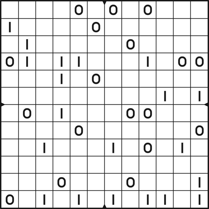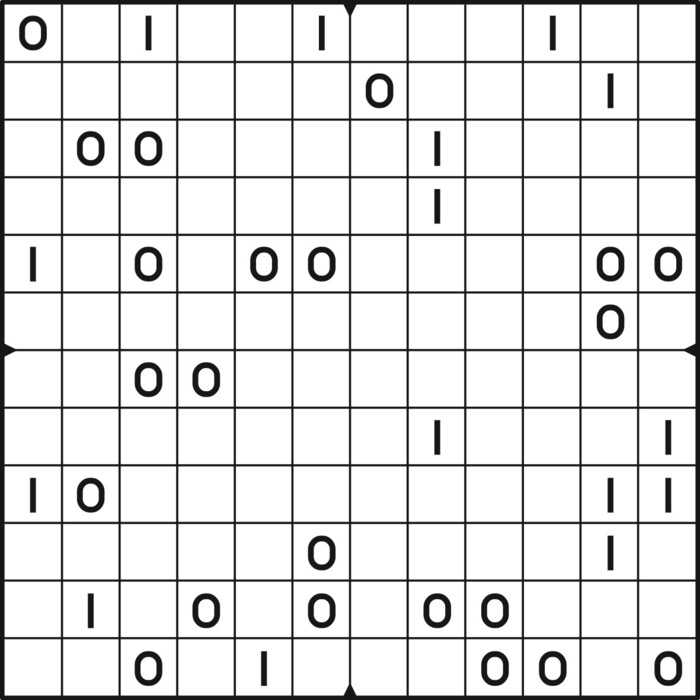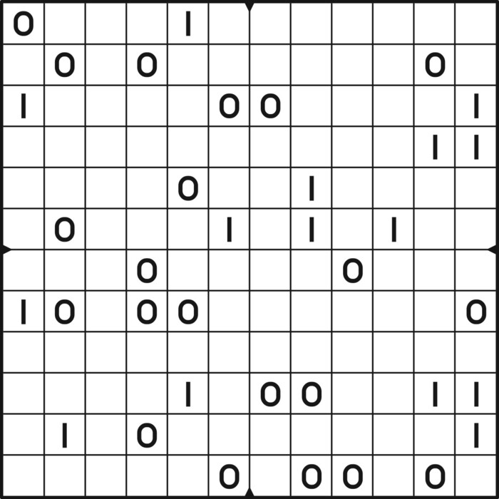 A daily binairo puzzle! Solve each puzzle with only 0's and 1's. Remember: No more than two the same numbers may be placed directly next to or below each other. Every row and every column must contain as many zeroes as ones. The combination of zeroes and ones in every row must be unique, as does the combination in each column.