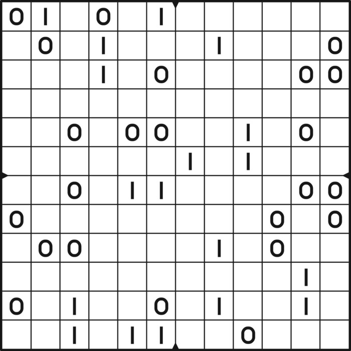 Every Sunday solve a special edition binairo. Remember: Solve each puzzle with only 0's and 1's and no more than two the same numbers may be placed directly next to or below each other. Every row and every column must contain as many zeroes as ones. The combination of zeroes and ones in every row must be unique, as does the combination in each column.