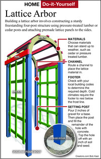 Dear Mike: An arbor with plants around a door can be very attractive and functional. Proper construction of an arched arbor is a fairly complicated project requiring power tools. If you want to make it decorative and appear professionally made, plan on using a router to prepare the slots for the sides and lattice.